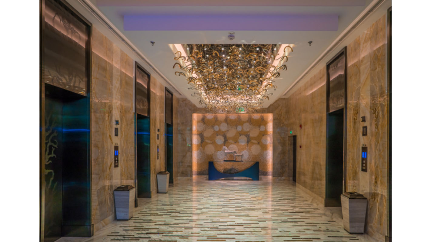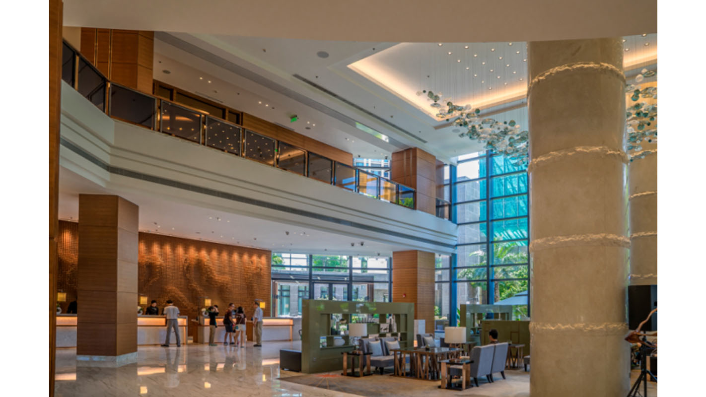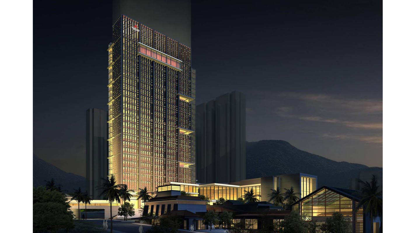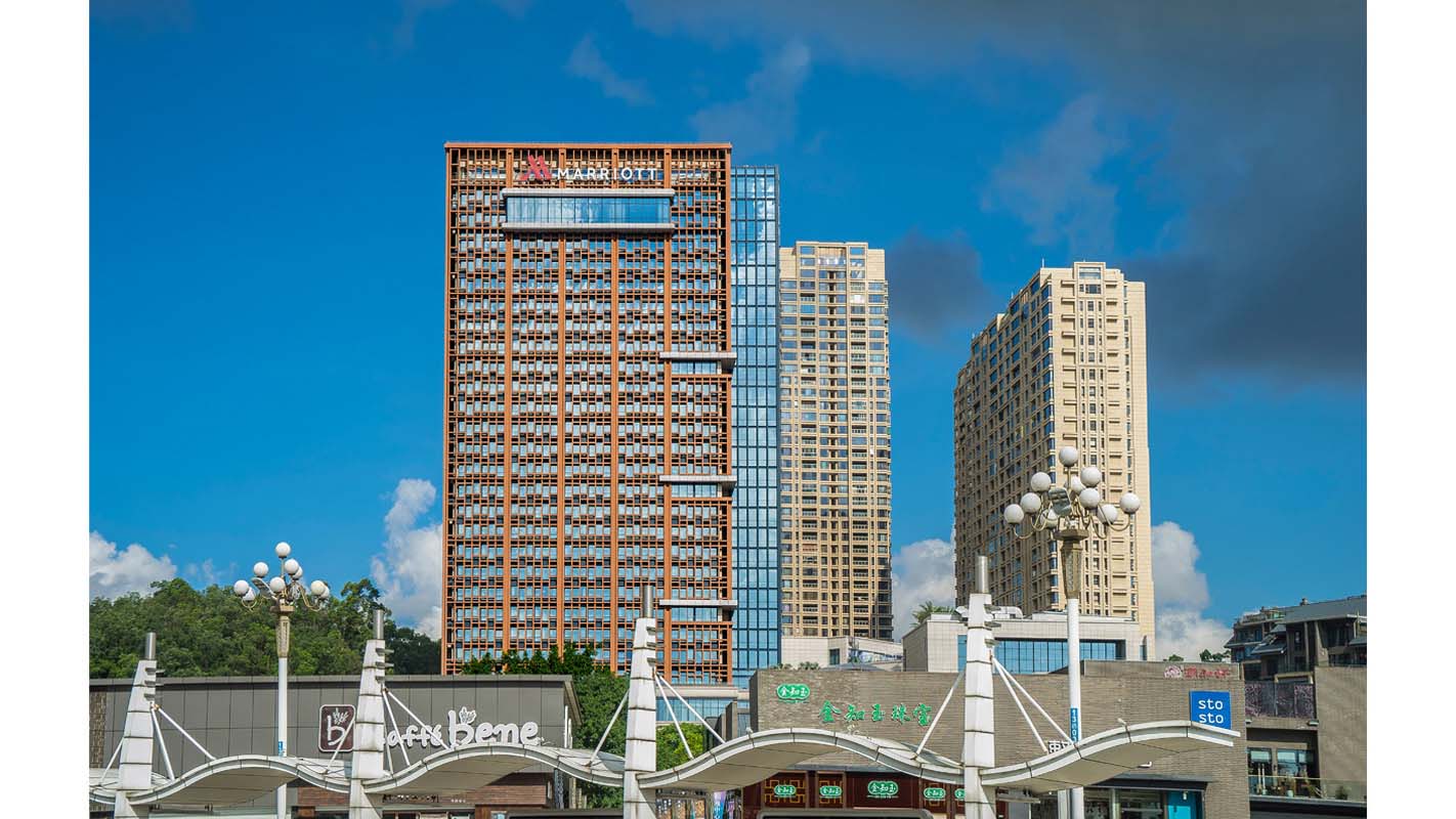 “珠海宾馆改造项目——珠宾万豪酒店”位于珠海市吉大商业区景山路西侧,北临石景山,东面为珠海渔女风景区,南临吉大中心区,距离海岸线直线距离不足一公里,自然景观资源丰富且交通便利,本酒店是改造项目其中一部分,新建建筑为地上 27 层,地下 2 层,功能为酒店及其配套服务设施。在造型设计手法上,以虚实对比、体块穿插为主。同时还考虑珠海的南方滨海城市的气候特征与建筑基地条件限制,在外部元素的选材上,考虑新旧融合,使建筑具有浓厚的岭南文化特征的同时又具有时代特征和现代气息。