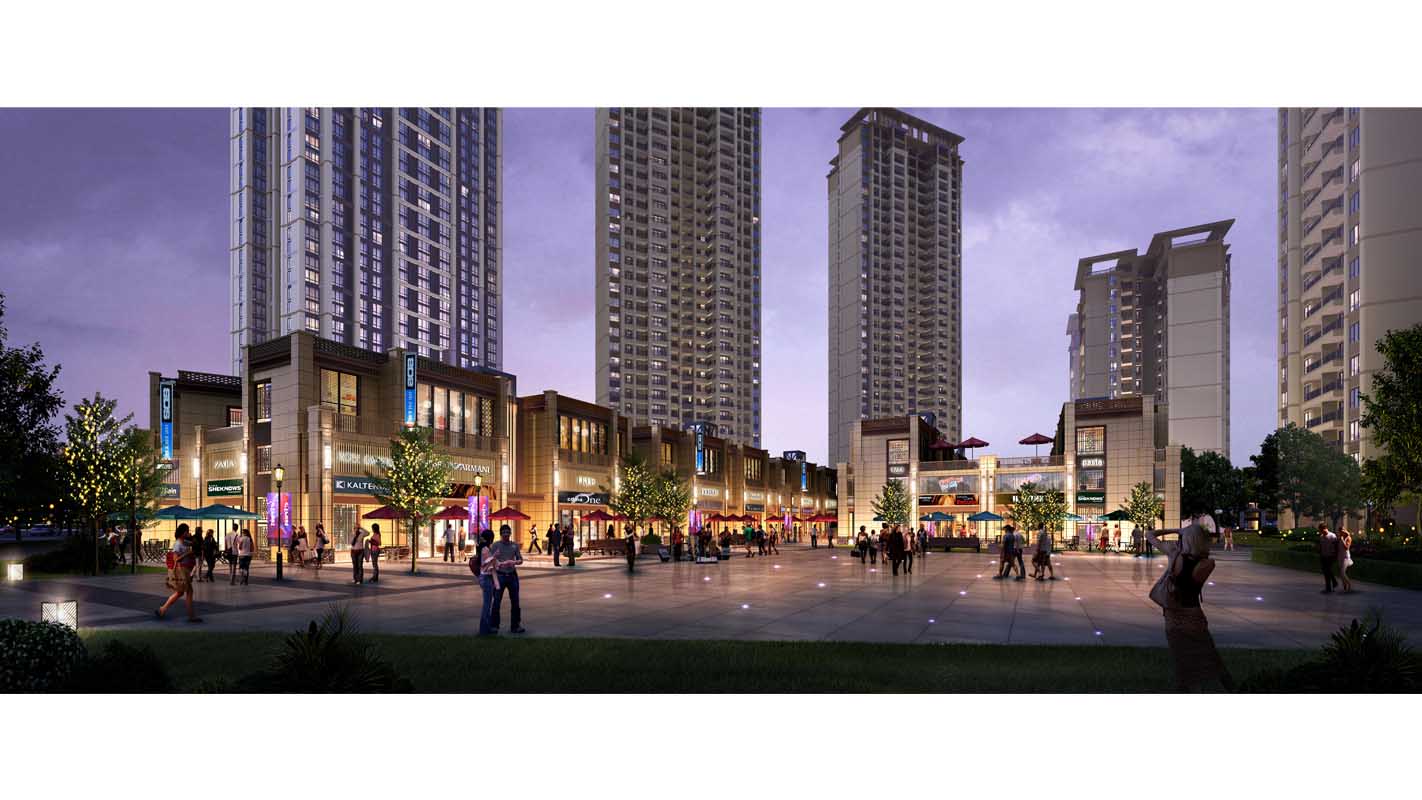 沿用地西侧城市广场和南侧城市道路设置临街商业街铺,沿用地东侧设置风情商业街,形成良好的商业氛围。高层住宅和公寓沿用地周围形成围合静谧的内院,内部开阔的园林东西延绵、南北贯通。住宅底层商业群房以外部分设为架空公共活动空间,并设物业服务用房和其他配套公共服务设施,以形成优良的居住环境。
