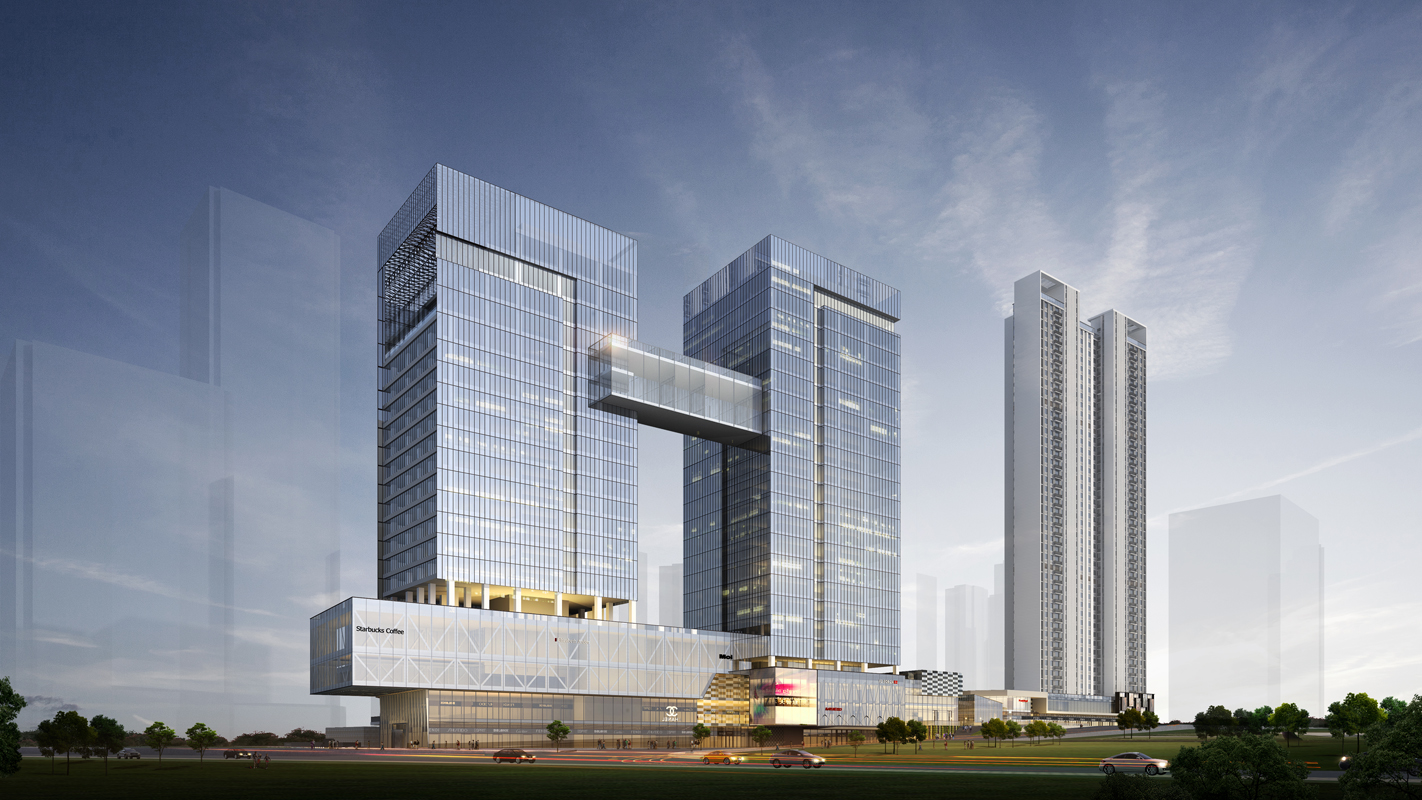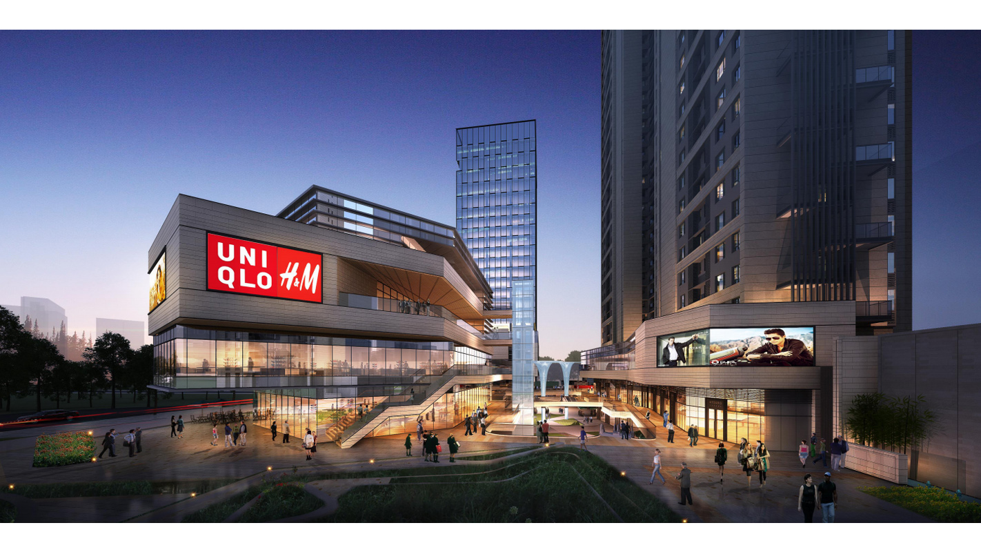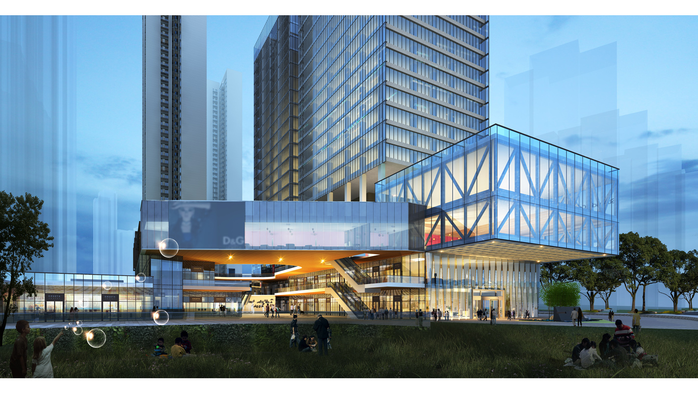 本项目充分利用城市景观的建筑、自然等要素,集商业、住宅功能于一体,采用集中式商业内街+住宅塔楼的方式布局,打造商业+生活综合社区,为居住人群和商家创造高效、灵活、舒适、方便的居住、商业空间。