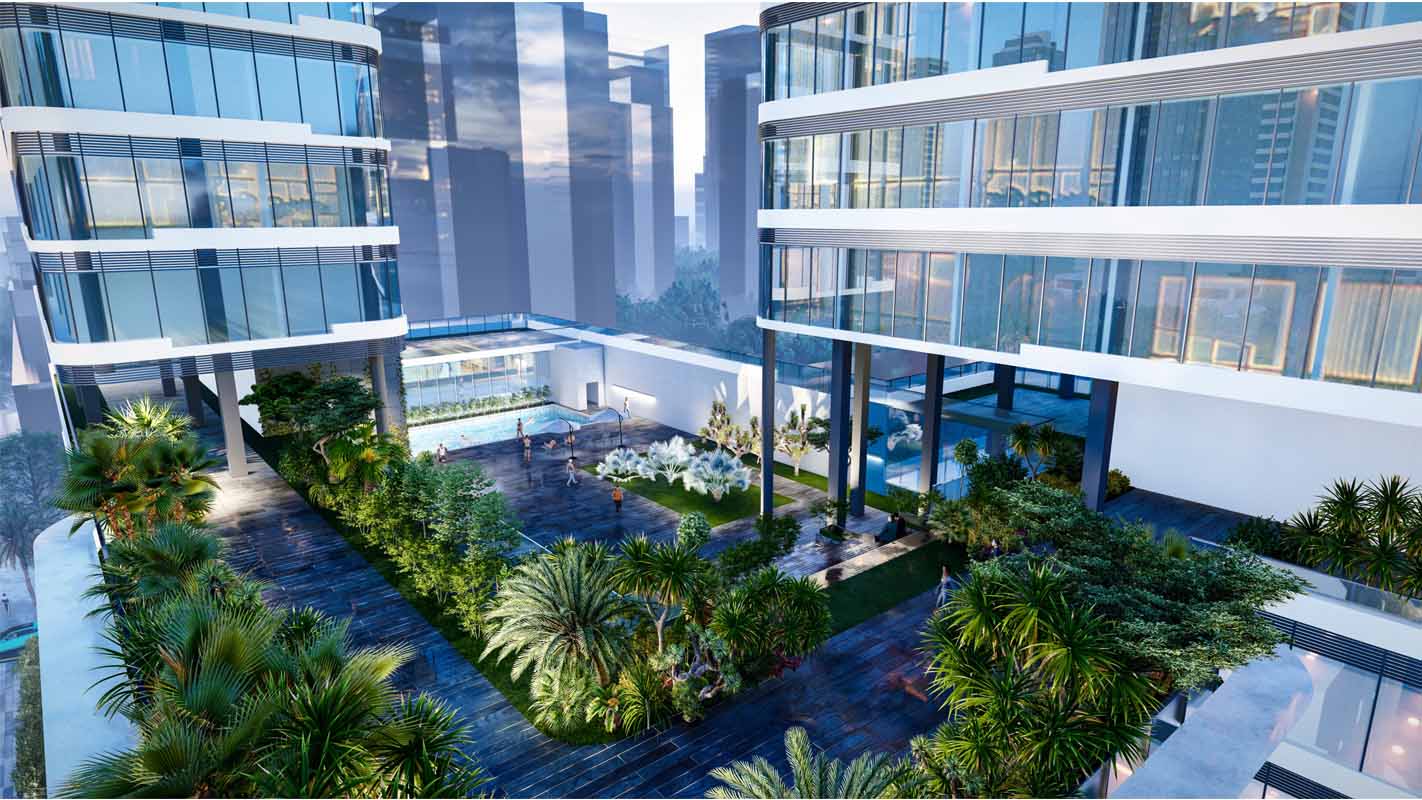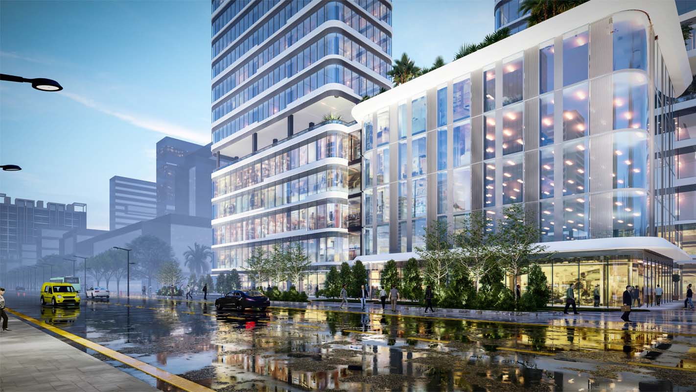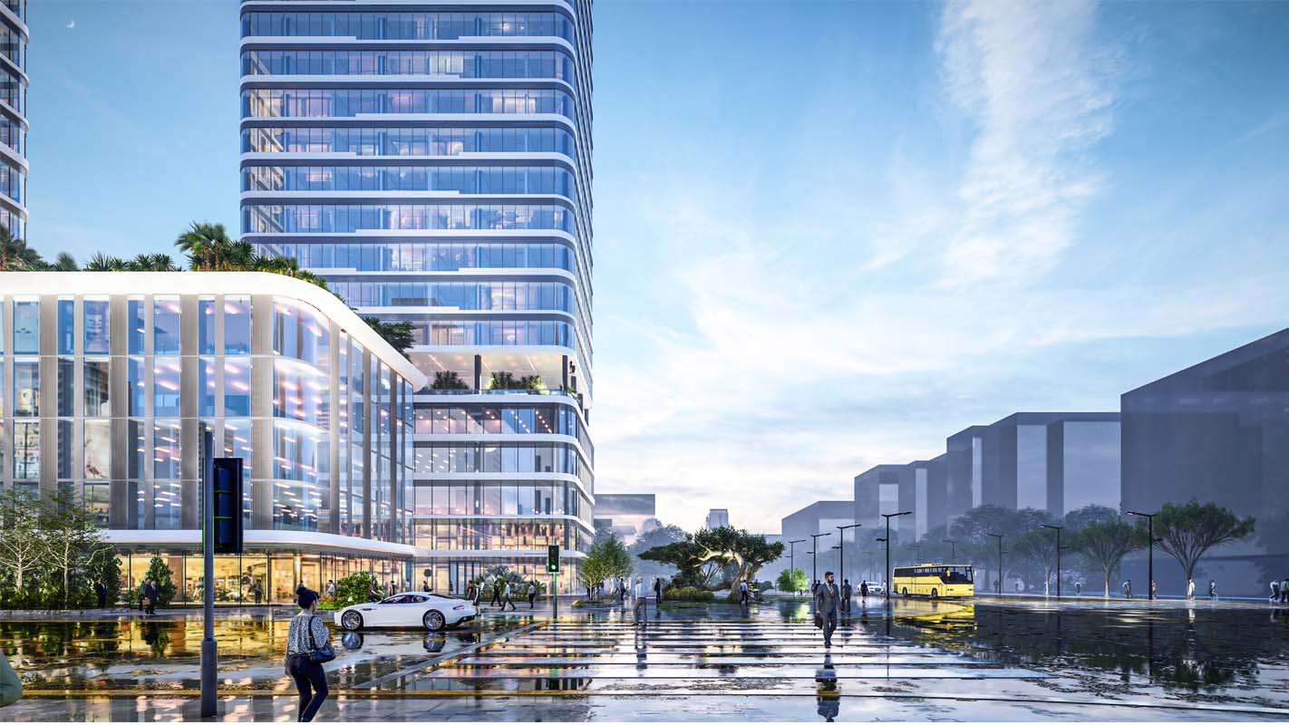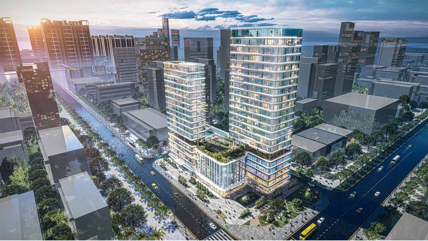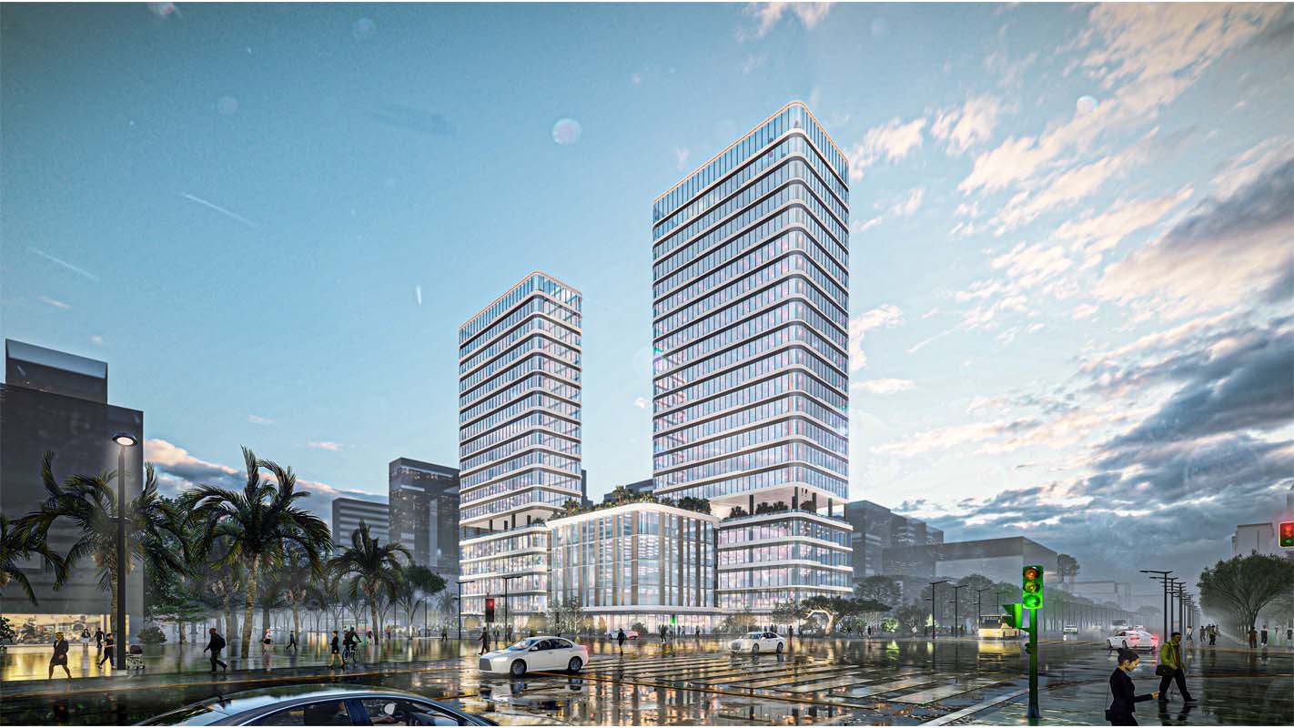 项目设计的建筑形态,横向线条的错落变化和简洁的体块咬合为基础,体现了人与建筑共生的理念。整个建筑的塔楼与裙房设计完全融为一体。塔楼上部竖直挺拔,呼应整个建筑形态。立面吸取了湾区海洋元素,通过横向线条的错落变化形成海滨风格的公共建筑立面。