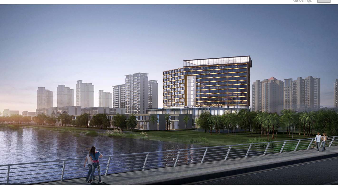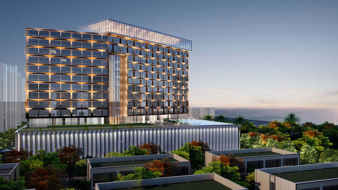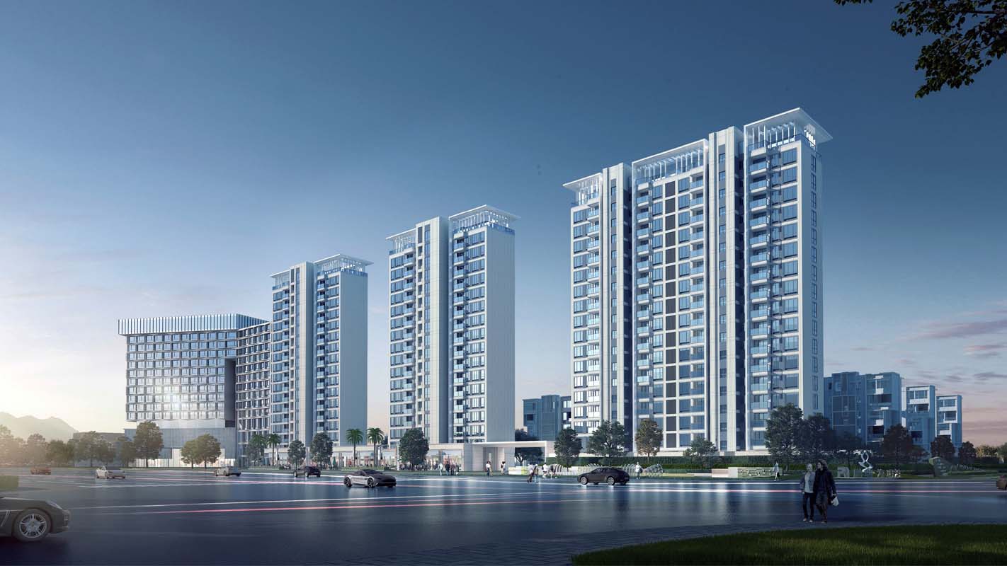 项目地上A地块北侧由3栋高层住宅和南侧6栋6层住宅、2栋2层商业楼建筑组成,B地块则由北侧由一栋15层酒店及2栋2层商业建筑组成。高层住宅及酒店位于地块北侧,俯瞰整个地块及南侧海景;多层住宅平均散布于地块中,围合出宽松、自由的尺度。