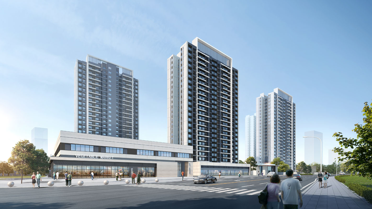本项目采用高层点式与板式结合的住宅体型,沿用地周边布置,并采用多景观节点花园与步行系统有机结合的规划结构,形成小区内有多个景观廊道,既保证每户的园林景观视线,又有较多活动空间;建筑采用简约现代化风格,以米白色和深灰色为主,户型力求方正实用,配套用房采用浅进深、大面宽的平面设计,为日后实用创造优越条件。
