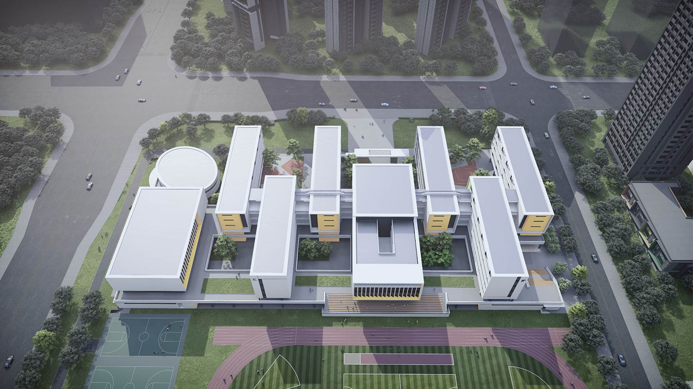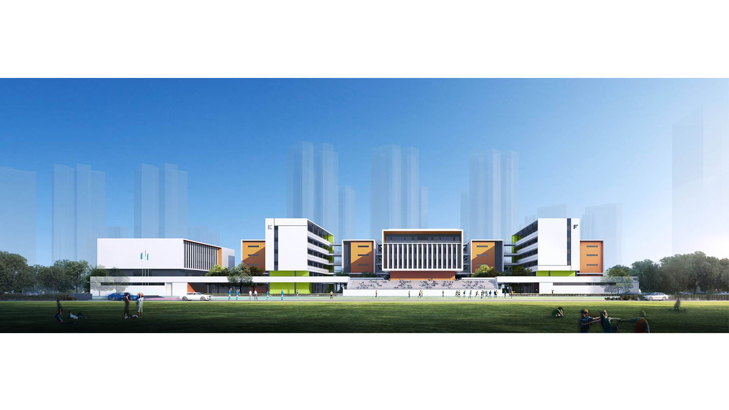 划设计从满足规范、集约用地、合理布置活动场地为原则,将小学教学区布置在地块西侧,运动生活区布置在地块东侧,既满足日照计算规范,拉开东侧地块与教学区之间的距离,尽可能减少互相之间影响,同时教学区西侧紧邻23米宽公园绿地,能有效控制市政路对教学区产生的影响。交通布置提倡人车分流设计,同时兼顾西侧主干道形象展示,人行主入口设在西侧中部,接送停车位设于地块北侧,地下停车库及食堂后勤流线设于地块南侧。教学区与行政办公楼采用错位的行列式布置,以南北两个教学组团,中部行政楼将南北两个组团串联起来,高效、合理组织交通动线。
