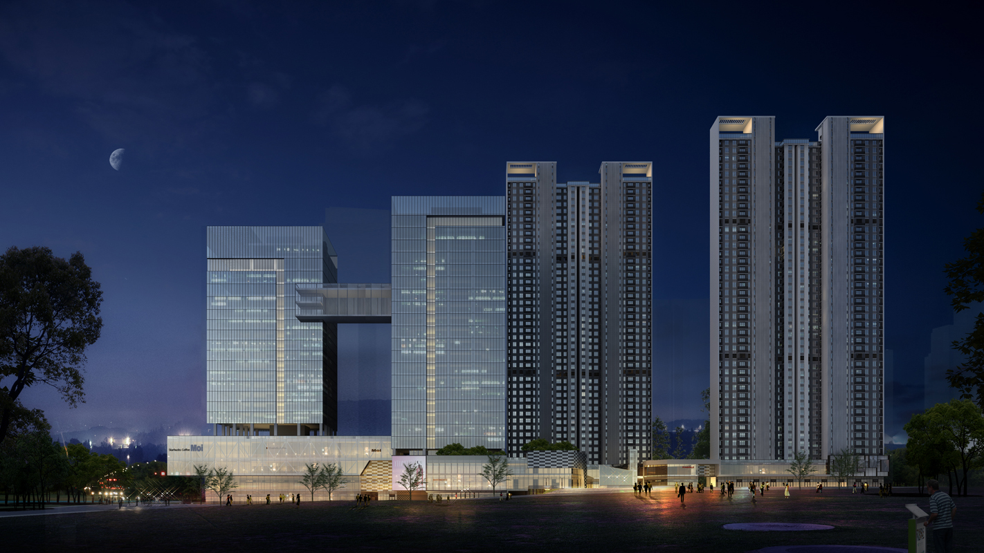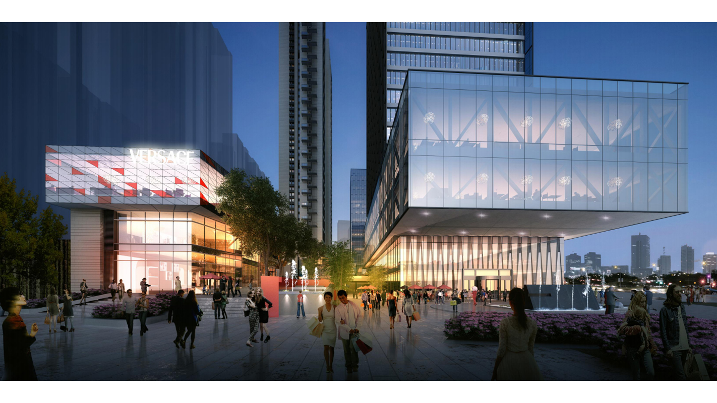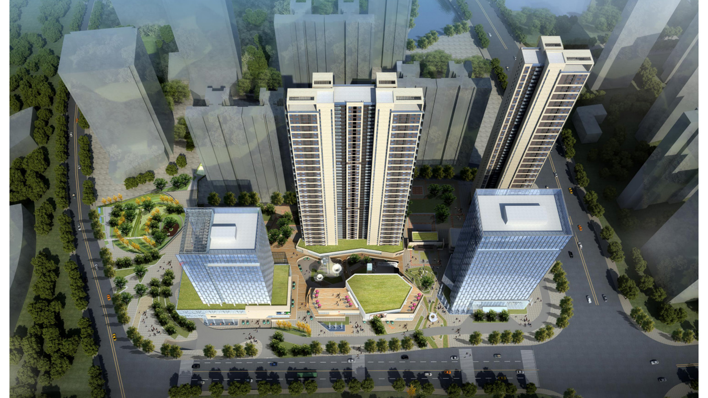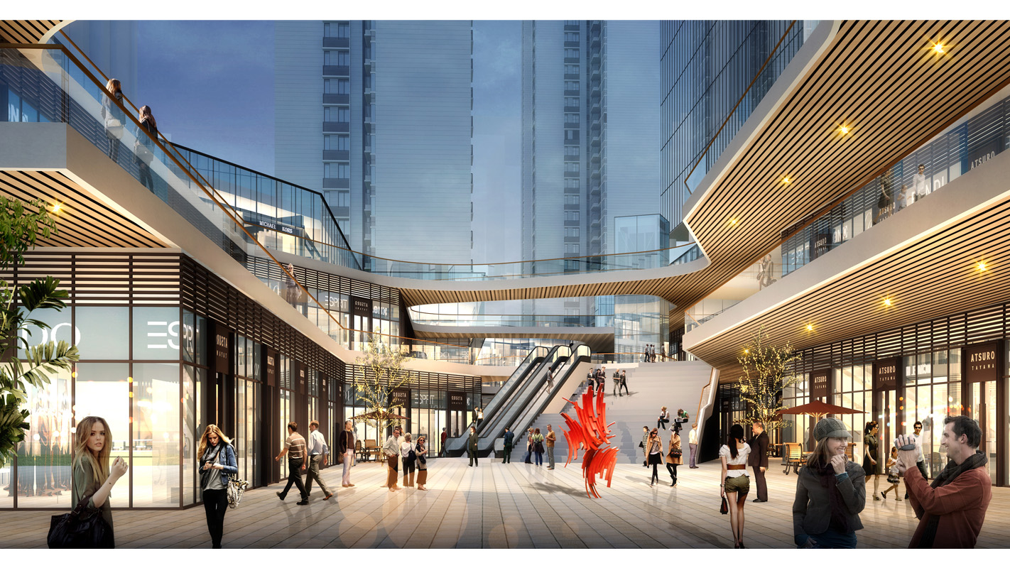 本项目充分利用城市景观的建筑、自然等要素,集商业、住宅功能于一体,采用集中式商业内街+住宅塔楼的方式布局,打造商业+生活综合社区,为居住人群和商家创造高效、灵活、舒适、方便的居住、商业空间。
