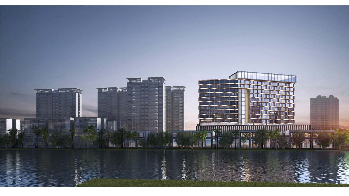 项目地上A地块北侧由3栋高层住宅和南侧6栋6层住宅、2栋2层商业楼建筑组成,B地块则由北侧由一栋15层酒店及2栋2层商业建筑组成。高层住宅及酒店位于地块北侧,俯瞰整个地块及南侧海景;多层住宅平均散布于地块中,围合出宽松、自由的尺度。
