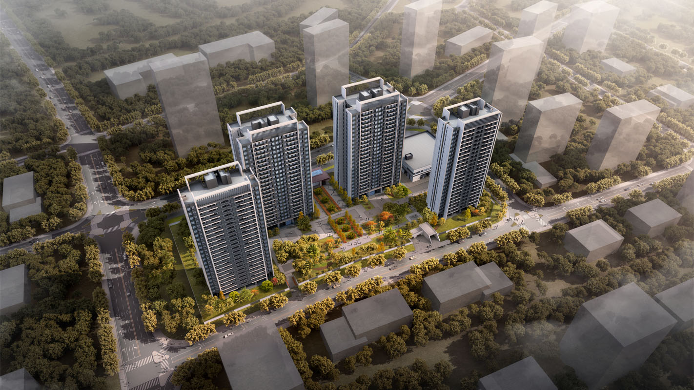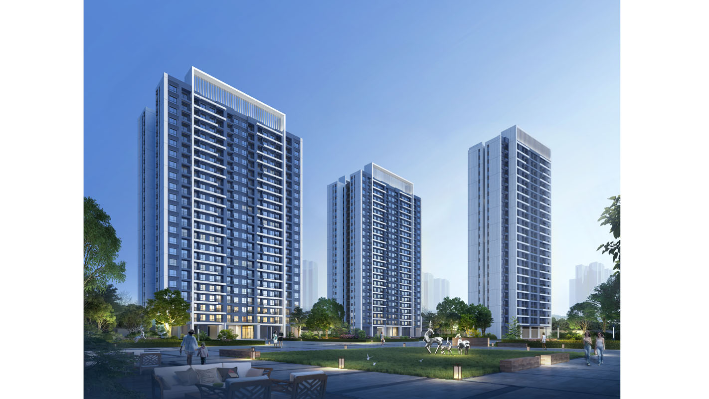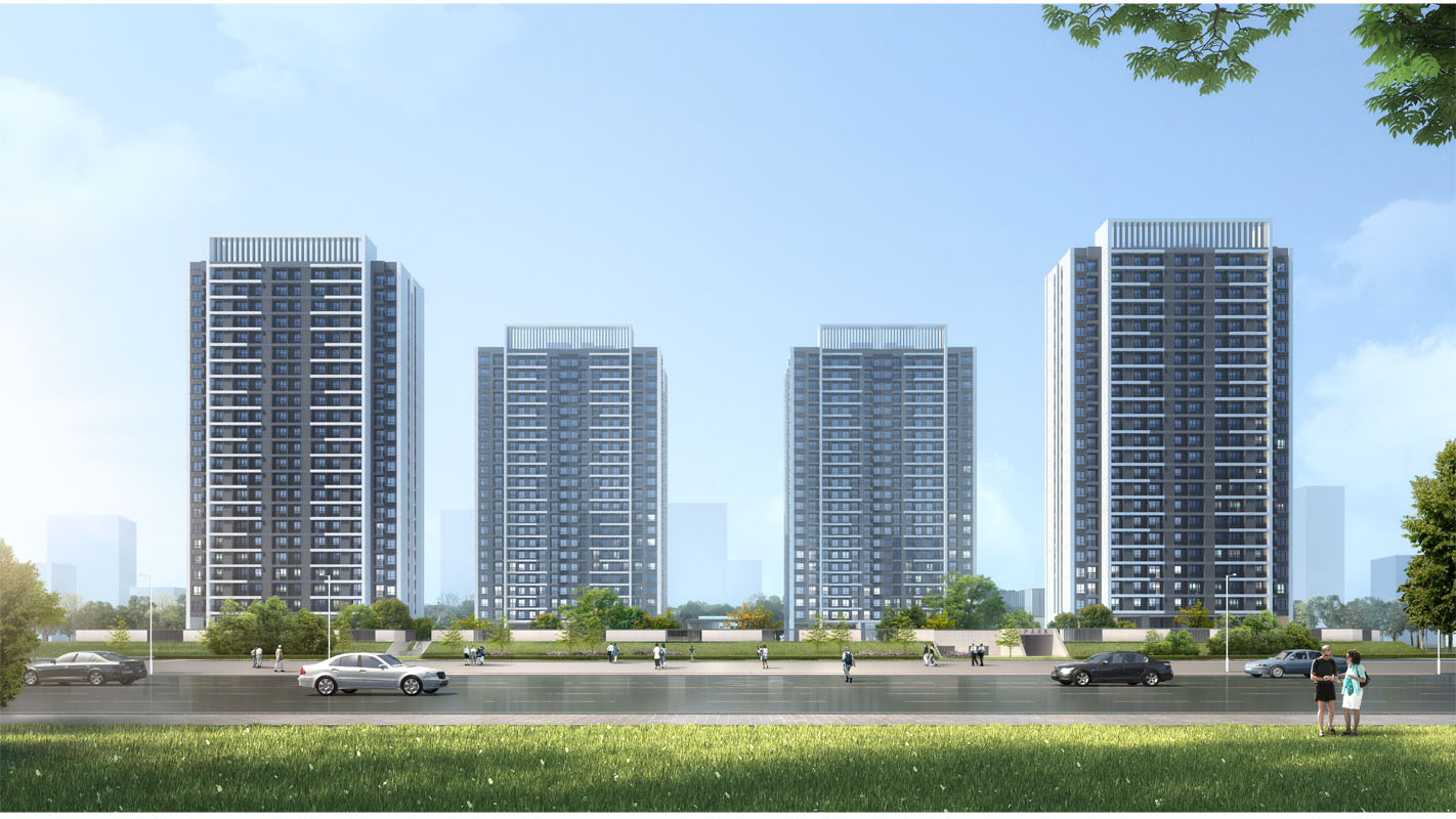 本项目采用高层点式与板式结合的住宅体型,沿用地周边布置,并采用多景观节点花园与步行系统有机结合的规划结构,形成小区内有多个景观廊道,既保证每户的园林景观视线,又有较多活动空间;建筑采用简约现代化风格,以米白色和深灰色为主,户型力求方正实用,配套用房采用浅进深、大面宽的平面设计,为日后实用创造优越条件。