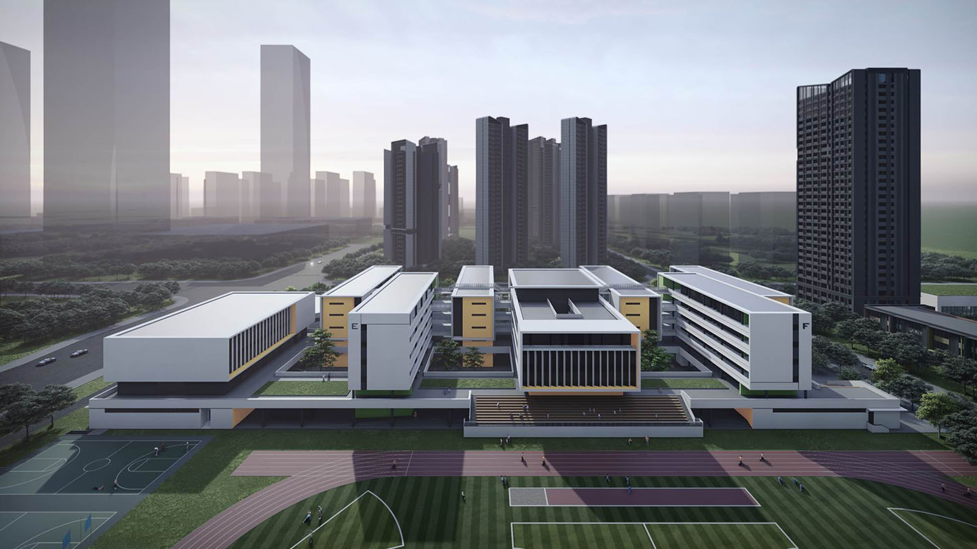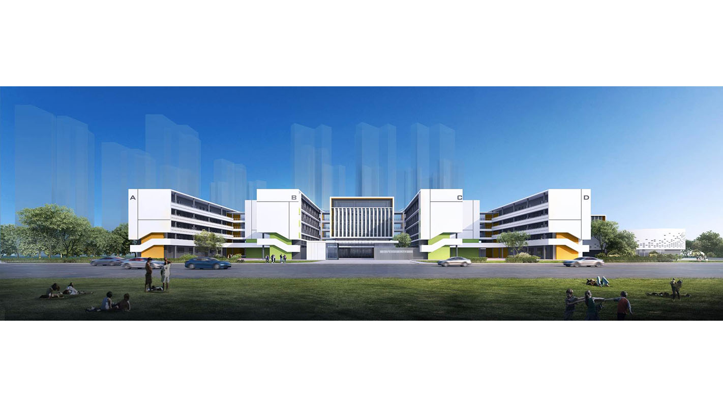 划设计从满足规范、集约用地、合理布置活动场地为原则,将小学教学区布置在地块西侧,运动生活区布置在地块东侧,既满足日照计算规范,拉开东侧地块与教学区之间的距离,尽可能减少互相之间影响,同时教学区西侧紧邻23米宽公园绿地,能有效控制市政路对教学区产生的影响。交通布置提倡人车分流设计,同时兼顾西侧主干道形象展示,人行主入口设在西侧中部,接送停车位设于地块北侧,地下停车库及食堂后勤流线设于地块南侧。教学区与行政办公楼采用错位的行列式布置,以南北两个教学组团,中部行政楼将南北两个组团串联起来,高效、合理组织交通动线。