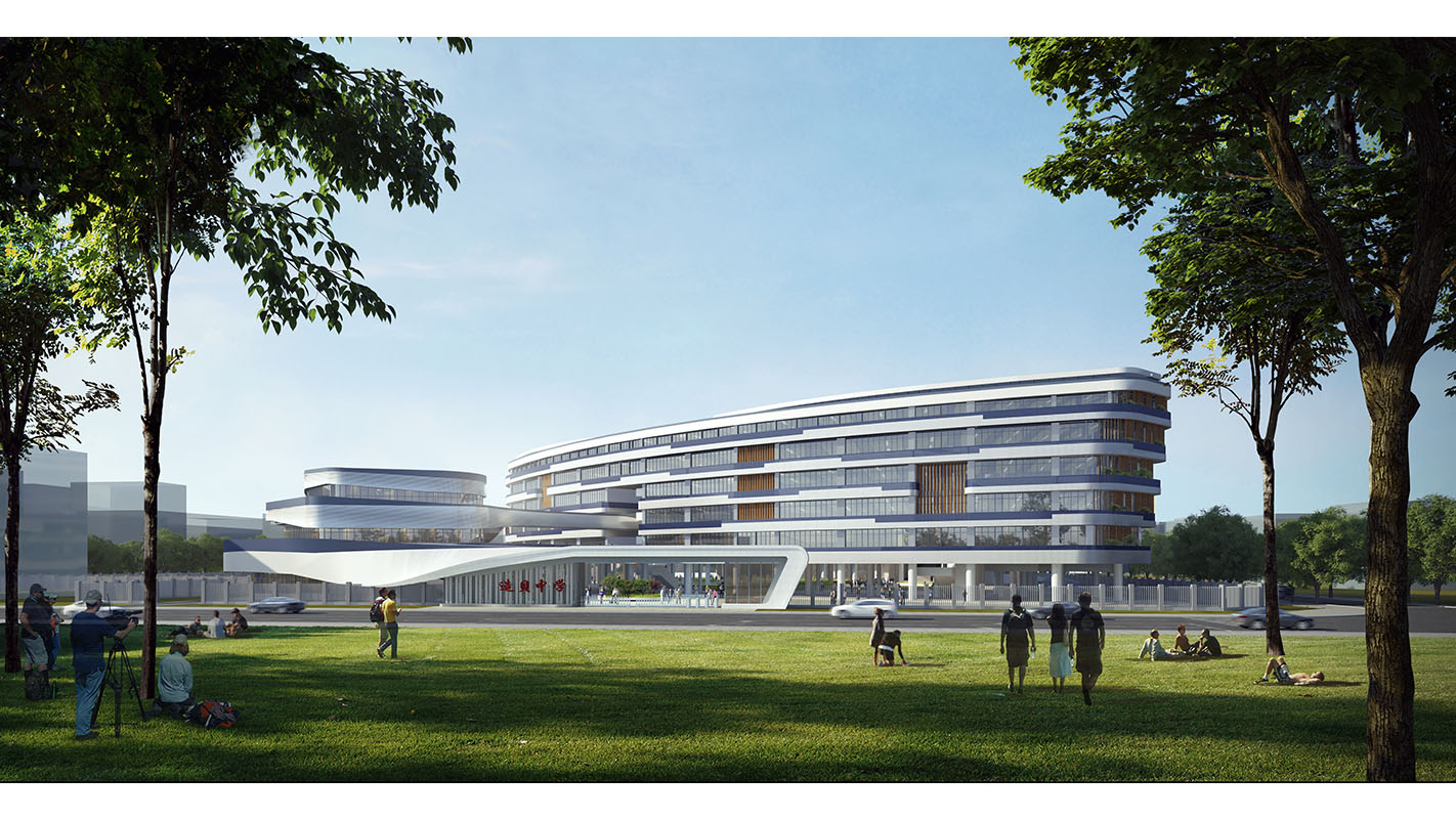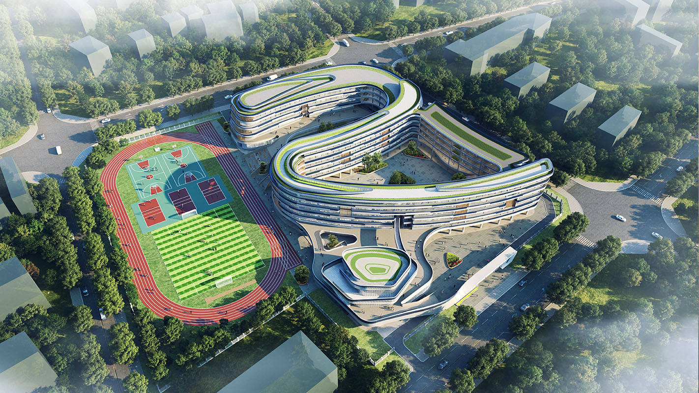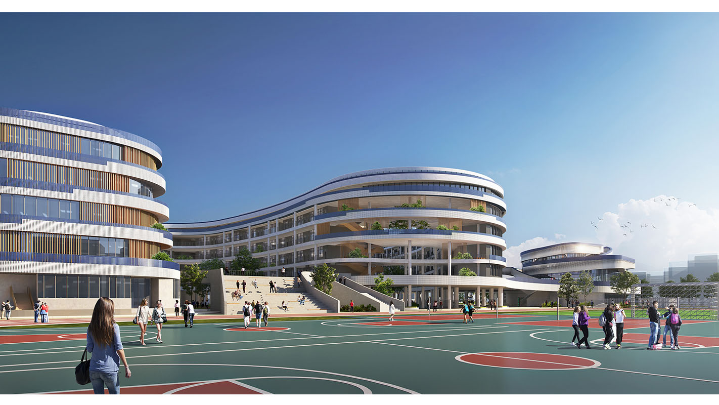 本项目立面造型取“造贝”首字母"Z",以中国传统书法飘逸的形态为基础,结合造贝村前山河畔的山水文化以“笔墨书法流水行水”为构思主题,构筑校园建筑形体;教学楼、综合楼、实验楼、体育馆及艺术楼等各区域有序串联在一起,如水墨笔刷,造型流动。建筑的首层大量架空,穿插其间的庭院设计开阔,便于活动。